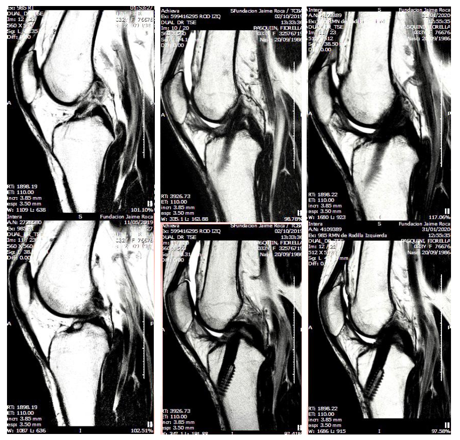 De izquierda a derecha: en la primera columna se observa la lesión en ligamento cruzado, en la segunda el postquirúrgico y en la tercera columna, se muestra ya lista para la vuelta al deporte.
